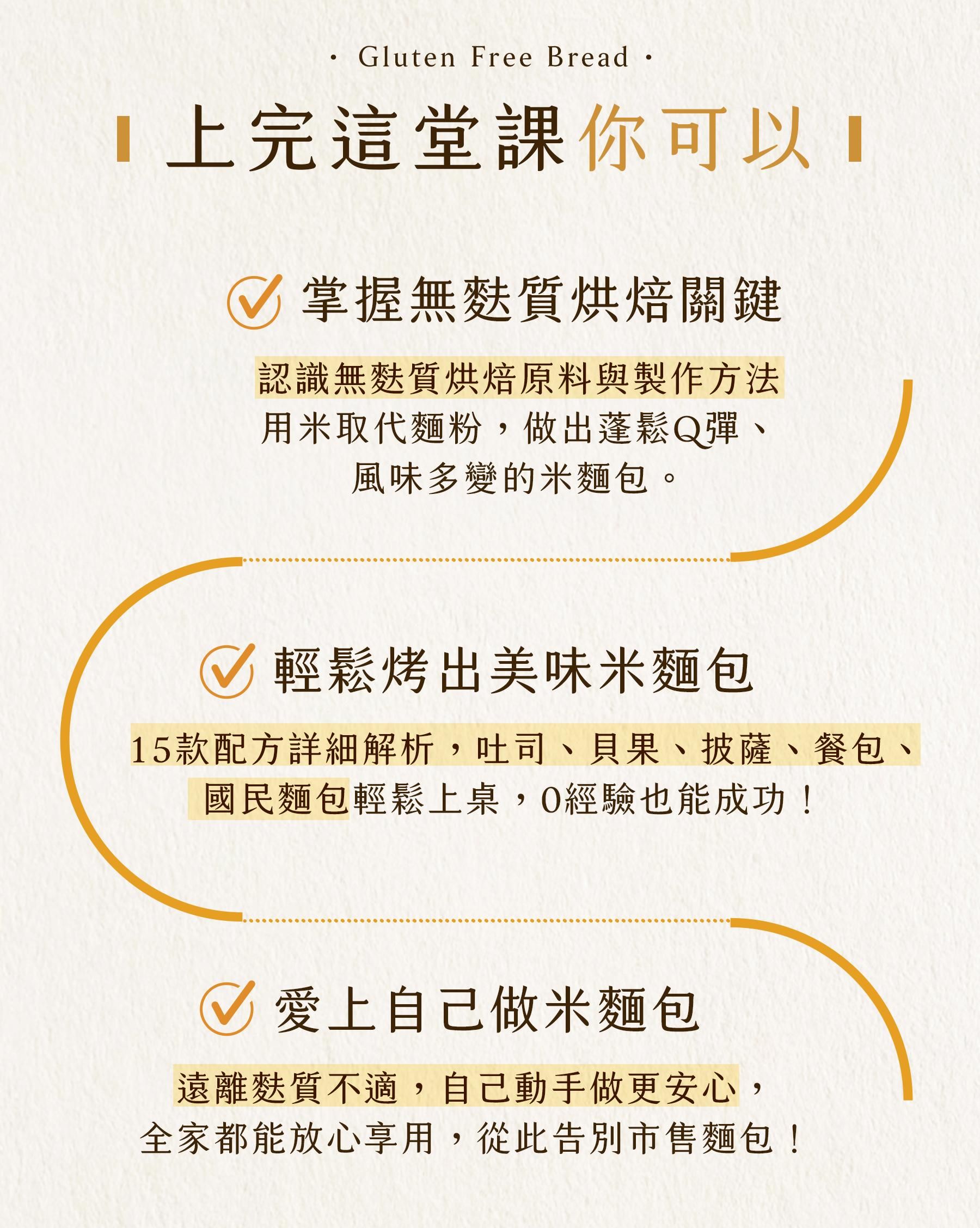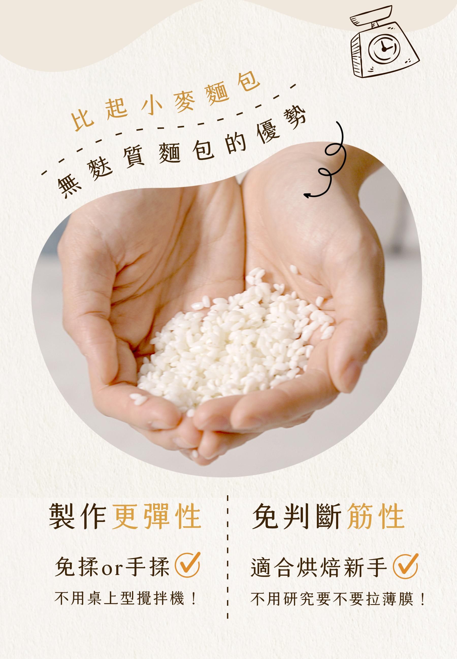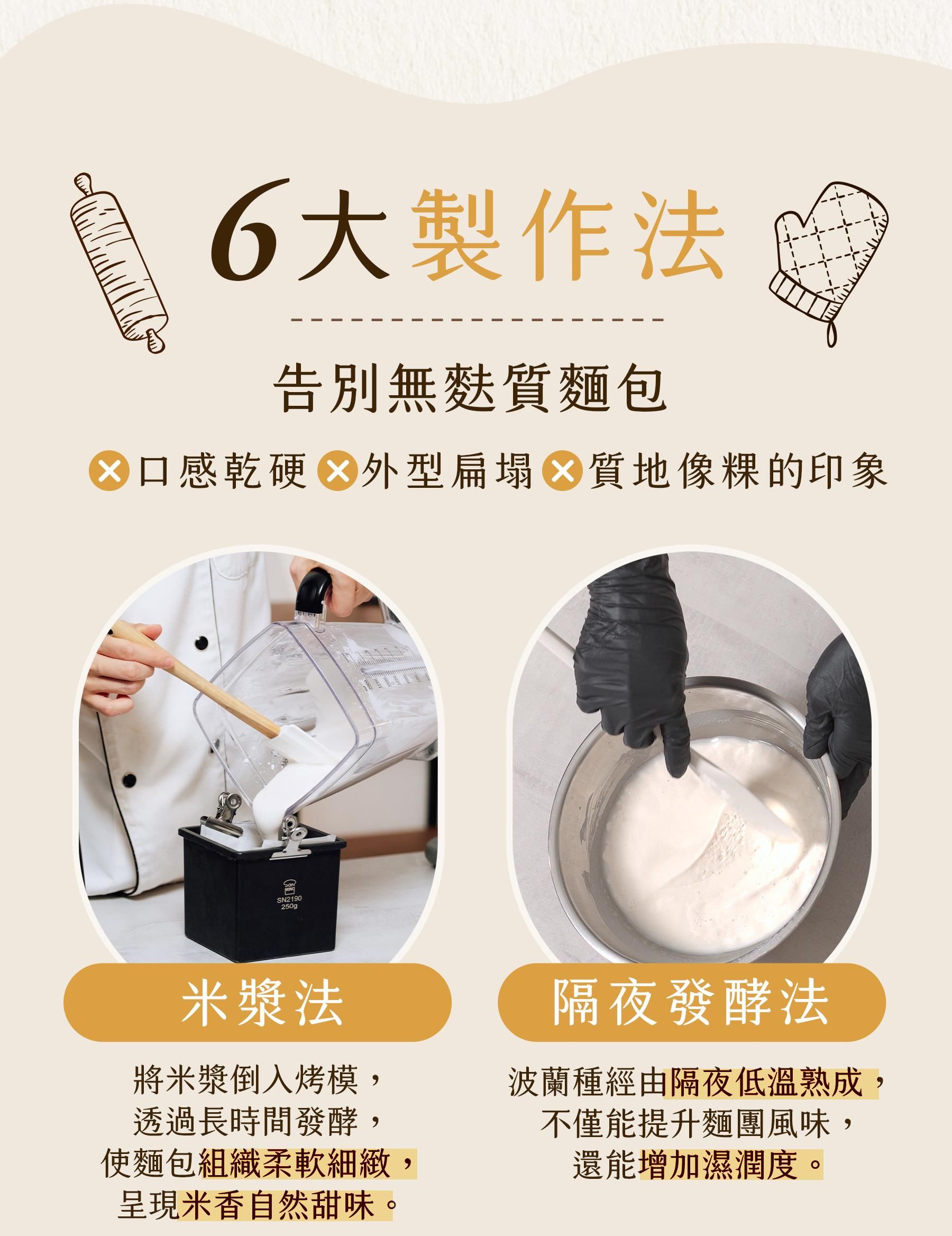6大製作法:米漿法、隔夜發酵法、湯種法、燙麵法、直接法、低溫發酵法,告別無麩質麵包口感較硬、外型扁塌、質地像粿的印象。